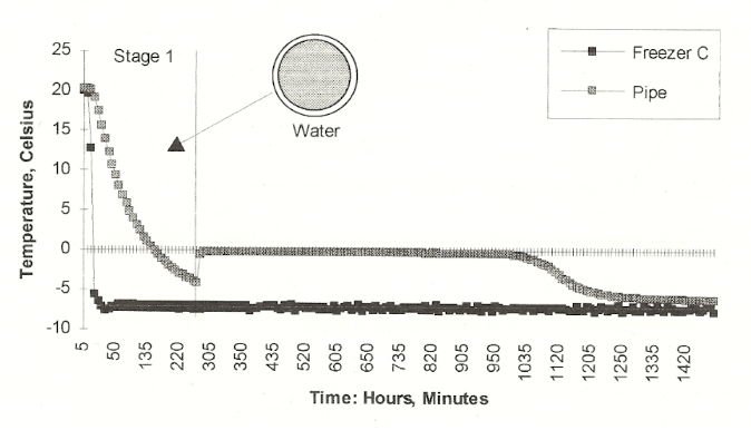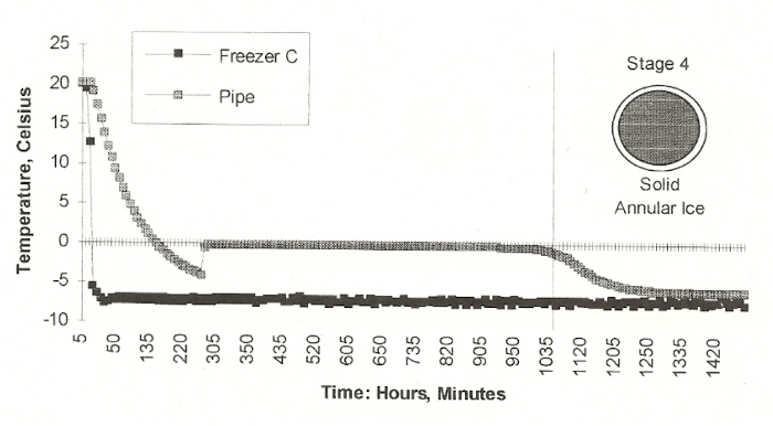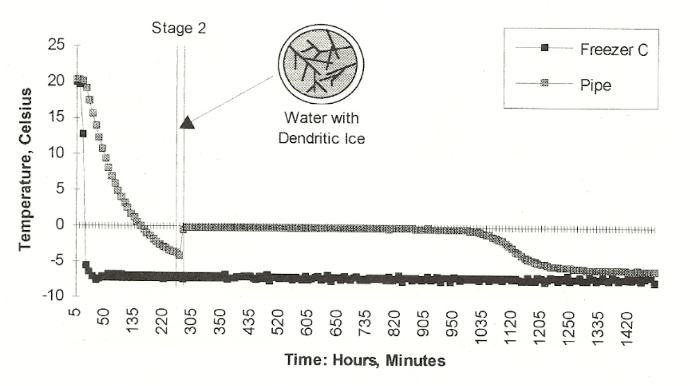 Here is the sequence of ice formation that Jeff found. First, the freezer temperature declined, and even went to around -4 degrees C. Then, in a flash, dendritic ice forms in the water, and the heat of fusion brings the temperature of now two-phase water-ice mix to exactly 0 degrees C, as it should. Then ice begins to grow from the wall of the pipe inward. This applies no stress whatsoever to the pipe wall, in fact it thickens and reinforces the pipe wall, now made of ice plus metal. This continues until the annular ice growth reaches the center of the pipe and blocks any water flow. At this point, the temperature of the now single ice phase may start going below 0C. And as ice grows, it grows along the length of the pipe.