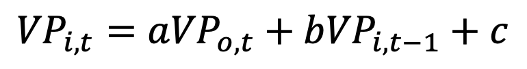 We have indoor and outdoor vapor pressure values, taken every hour (time t in the equation below). We may use the vapor pressure as a tracer gas, that distinguishes old from new air. We can plot the data in two columns, and do a linear regression to estimate interior vapor pressure (VP) from outdoor, using two inputs. The first input is obvious: the concurrent outdoor VP—new air. The second input to use is the previous reading of indoor VP—old air. The regression result will be: