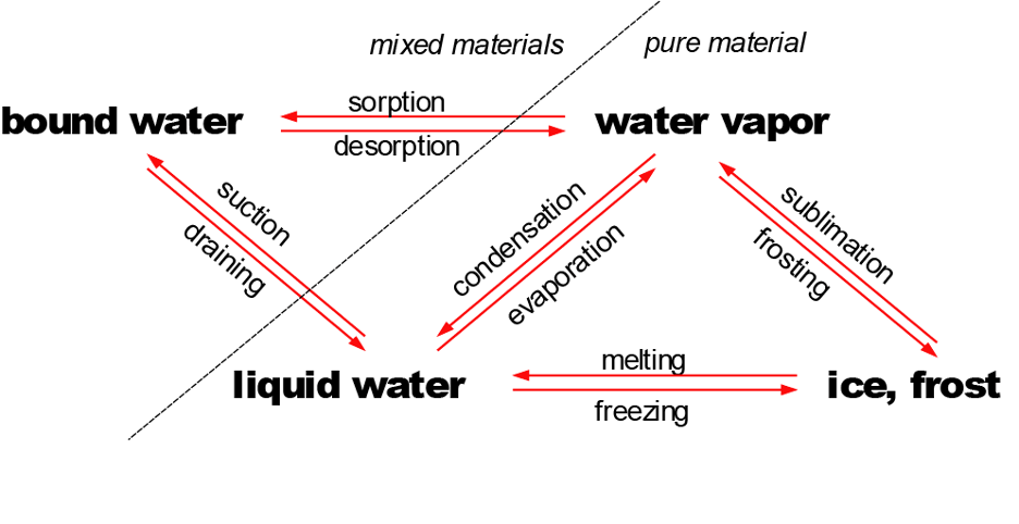 There’s a more fundamental point which I covered in the book, namely, bound water. Pure water has three (common) phases—vapor, liquid and ice. But what interests us in building science is, actually, impure water, dirty water, water that is somehow bound up with other material, like water in a sponge, a block of wood or a brick. Water is a polar molecule so it forms hydrogen bonds with itself (cohesion) and with other surfaces housing unbalanced charges here and there (adhesion).