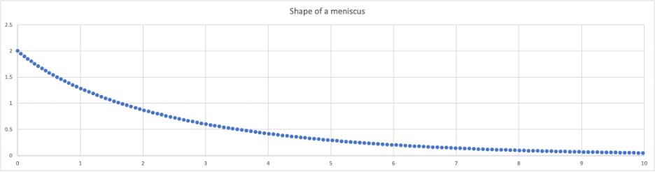 Figure 4. Plot of a water meniscus at a glass surface. Dimensions are in millimeters. Water molecules adhering to the glass are less mobile than water in the mass of the liquid.