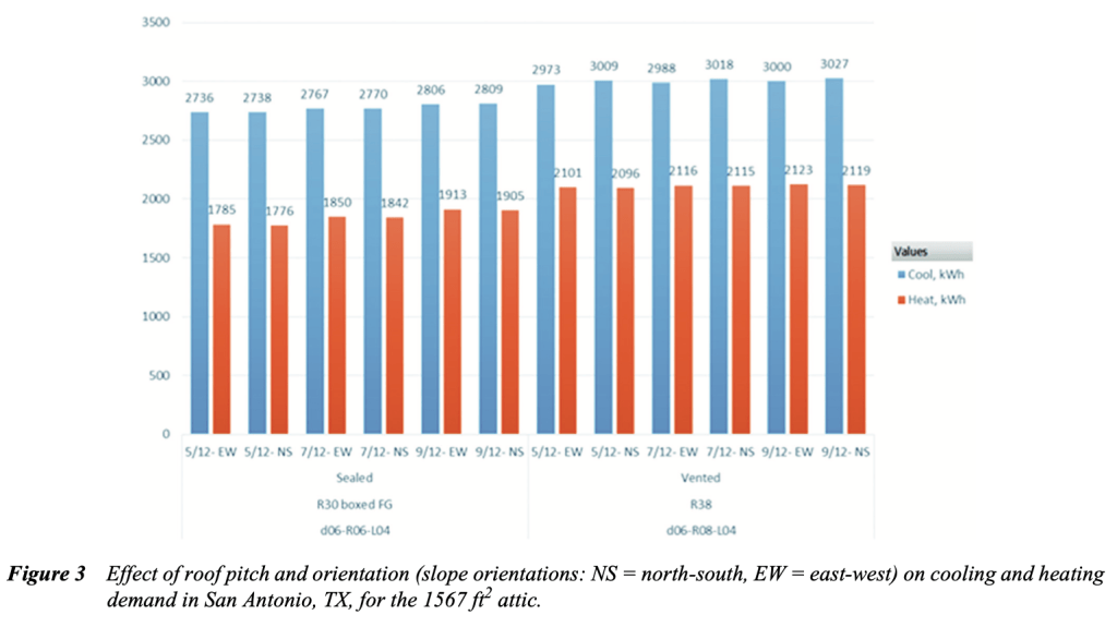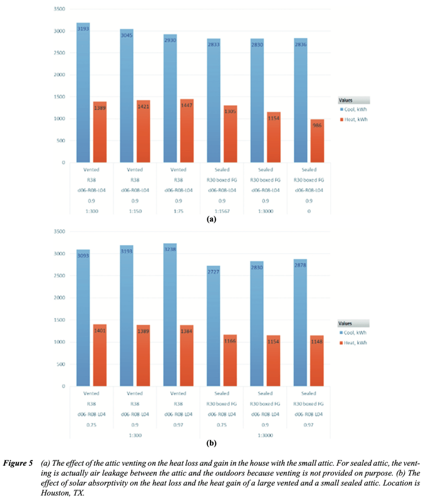And if you want good research, you set researchers like me aside and turn to the A-team. That would be Achilless Karagiozis and Mika Salonvaara, and add Bill Miller who really knows Southern attic construction. The three of them published a paper for the 2016 Clearwater Conference on energy use in vented and sealed attics in Climate Zone 2A, which represents the Gulf Coast, with a focus on Houston.1 This was a modeling study, using a heat and moisture attic performance model developed by Ken Wilkes, the grandfather of such studies. The study looked at various parameters such as shingle emissivity, roof pitch and orientation, but our main takeaway is venting versus not venting of Southern climate attics. Modeling study outcomes depend entirely on the assumptions on which the study is based. One of the critical assumptions made in the Clearwater paper is the remaining leakage area in the sealed attic cases. Your assumptions may differ.