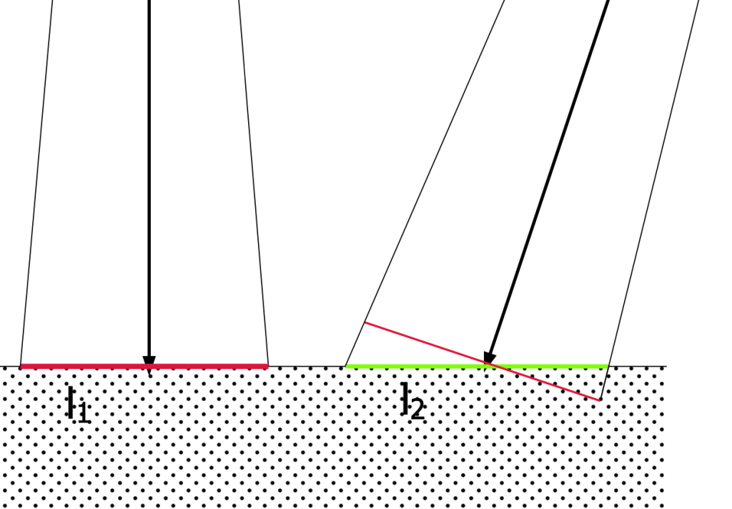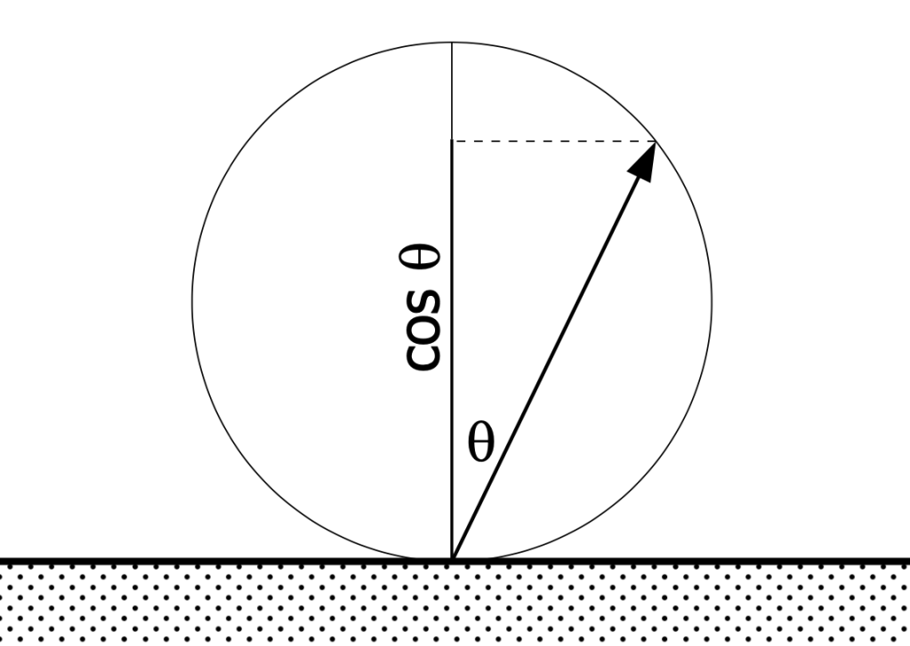 To explain why, we need to go to optics described in Johan Heinrich Lambert’s 1760 Photometria. He sought to explain why the apparent luminance of a diffuse-light (non-reflecting, non-directional) surface remains the same whether the surface is viewed directly—normal to the plane of the surface—or at an angle. See figures 1 and 2. Assume we have an observation cone of the same shape and size. It will “see” a circle of the surface (l1, red) when viewed normal, and, if viewed from an angle, will “see” an ellipse (l2, green), larger in area than the circle. The area of the ellipse will equal the area of the circle, divided by the cosine of the angle. So the luminous intensity of the circle must be greater than the intensity viewed from an angle. This is Lambert’s Law, where the intensity of light emittance from the surface is a function of the angle of emittance, and the intensity at an angle equals the intensity normal times the cosine of the angle. See figure 3. The intensity effect and the area effect cancel each other out, so the luminance doesn’t change with observation angle.