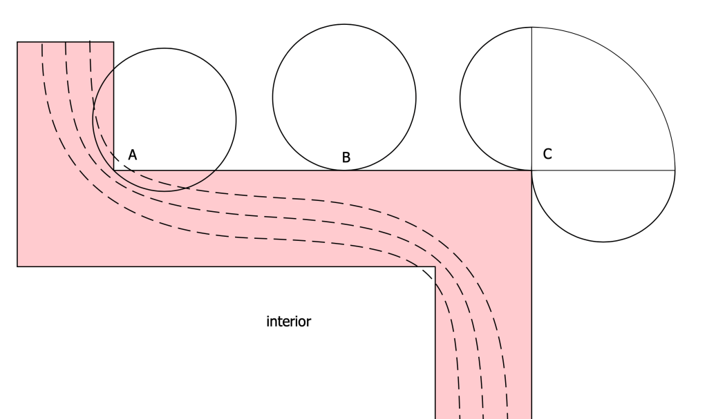 This helps explain something we see in infrared thermography. If a building is warm inside compared to the outdoors, then outside corners of the building appear especially cold, and any inside corners appear especially warm. See figure 4. The diagram at figure 5 explains the two effects at work here. The principal effect has to do with simple heat conductance as represented by isotherms (dashed lines) in any two- or three-dimensional arrangement with corners. A secondary effect is seen in emissive intensity. The circle at B represents intensity typical of radiant effects on a flat surface, as seen in Figure 3. At an outside corner there is more exchange with the outdoor environment (C), and at an inside corner there is less.