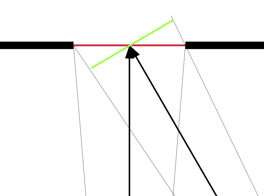Which leads us to estimating what is the vapor pressure reduction over a curved meniscus, Figure 8. If we look at a “hole” at point P, and a circle which represents the Lambert probability of a molecule making it through the hole, we note that some of the molecules, the ones at an angle close to the meniscus like the small blue arrow barely visible at the top of the circle, will be emitted not into the air but eventually back onto the water surface. In a sense, the air above the meniscus will not be affected by emission from the surface back onto the surface. The molecules going surface to surface represent those not going into the air, thus they represent the vapor pressure reduction due to curvature. The emission of light from a diffuse surface, and the emission of molecules from a meniscus, follow the same rules regarding emission direction compared to the plane of the surface.