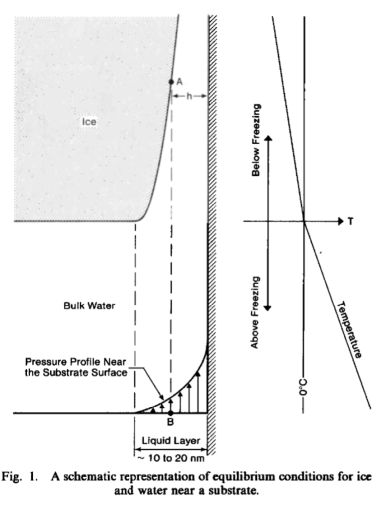 These researchers claim that as ice grows to within a few nanometers of the substrate, non-everyday pressures are achieved in the tiny gap. I have two big problems with that. 1) The substrate surfaces are shown as Euclidian smooth lines while at the nanometer scale everything is rough (three water molecules, for example, measure 1 nm across). Roughness alone would put solid surfaces into contact. 2) Ice nucleates at the substrate and grows inward toward the water, not the reverse. The ice-substrate interface is solid-solid, which cannot and does not apply pressure.