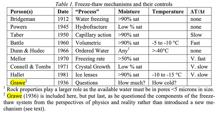 The paper by Grawe (1936) is cited within Table 1 insofar as it questioned the many held beliefs with regard to freeze-thaw weathering, notably the possible stresses that can be exerted by freezing water, and despite being published over 80 years ago the questions raised are no less valid today. Indeed, the veracity of freeze-thaw might be less strong had greater recognition been given to this paper in many studies. Grawe (1936) raised the questions surrounding the greater-than-any-rock-can-withstand pressures that freezing water can generate, and thus, in principle, the overall possible effectiveness of the process.