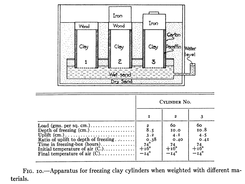 Taber’s name is remembered now for his laboratory work in 1929. Old research often shows appreciation for craftsmanship in experimental apparatus, and narrates the lab sequence as if the reader was looking over the shoulder of someone peering for the first time into an unexplored area. Old research often captures the thrill of discovery, such as here. Figure 1. shows a version of his setup, intended to measure frost heave lifting a weight. Cooling was from above. Clay, sand and soil was placed in cardboard cylinders (former milk containers according to the author), and these were waterproofed with paraffin or shellac. Ample water was provided to the sample through a hole in the bottom, and the sample was placed in saturated sand.